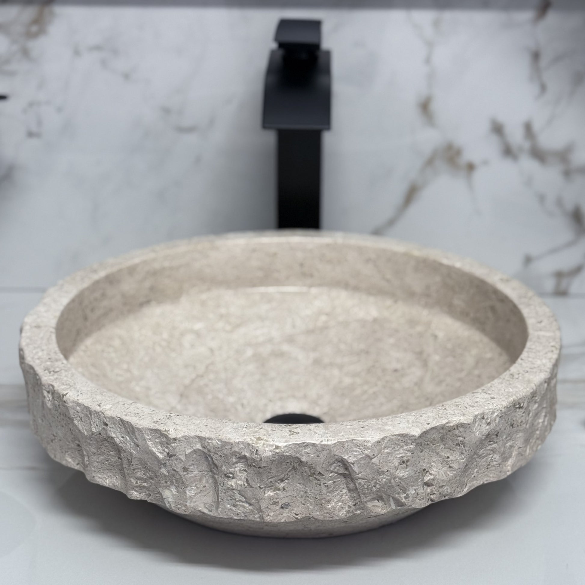 Round Travertine Vessel Bathroom Sink – Natural Stone Hand-Made Marble Sink – Tan Travertine Hand-Carved Stone Basin