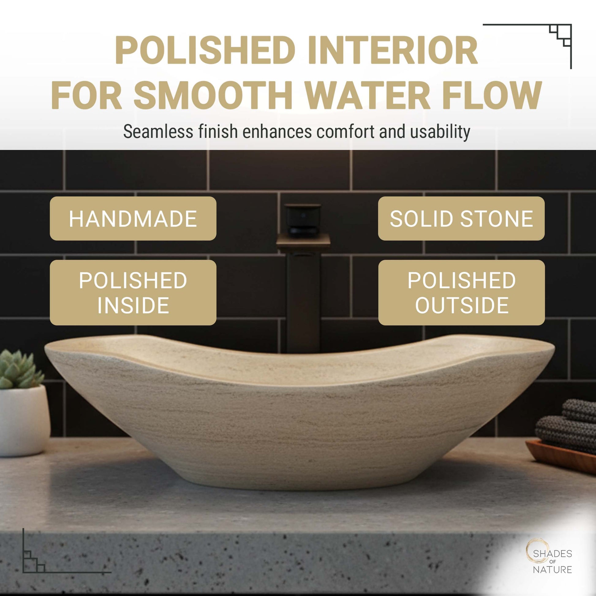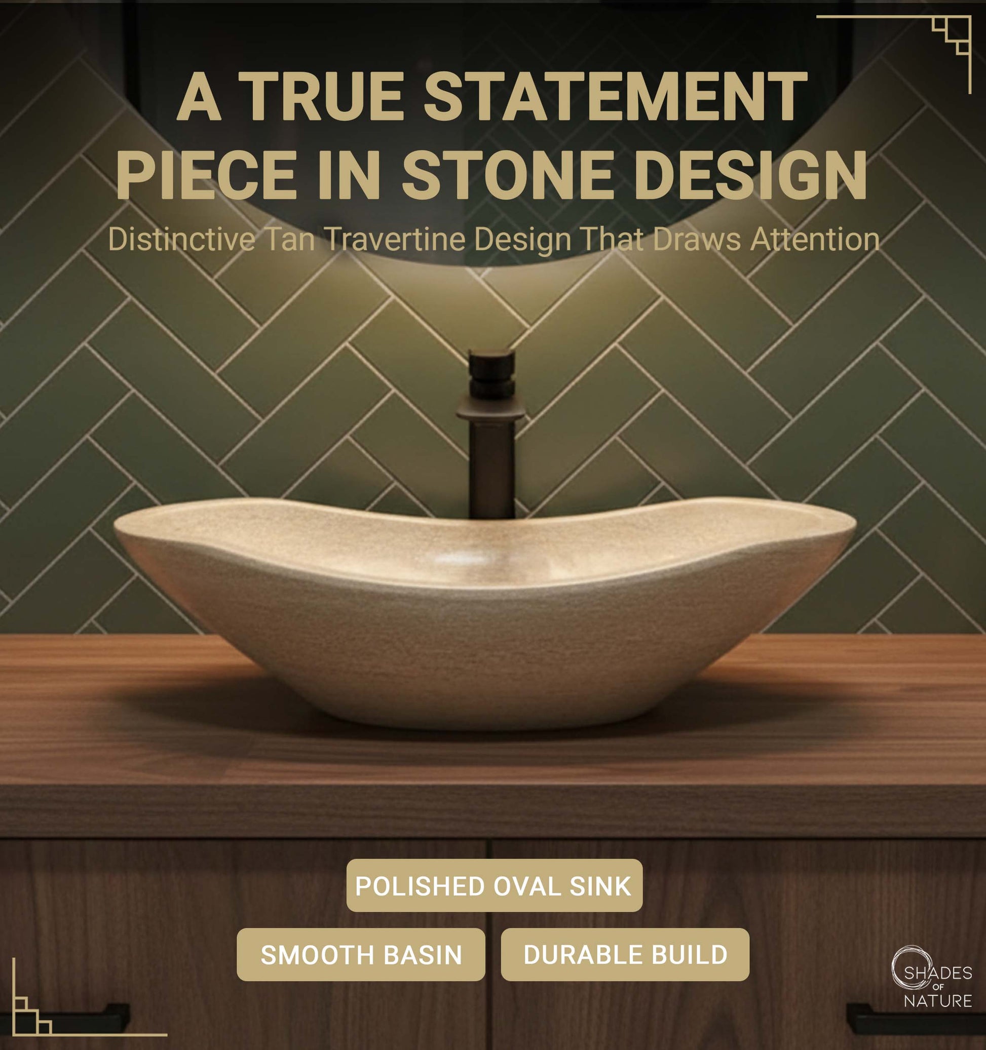 Crafted from 100% real stone, this oval polished travertine vessel sink combines timeless elegance with natural durability. Featuring a tan travertine color with rich horizontal grain lines, this bathroom sink is a statement piece that blends rustic sink charm with modern sophistication.