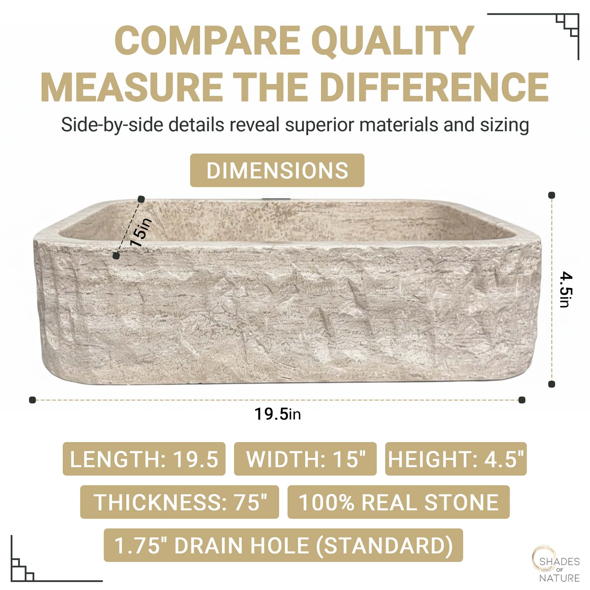 Larger than standard sizes, this stone sink provides a luxurious presence in your space. To ensure a seamless fit, we recommend measuring your countertop before purchase.