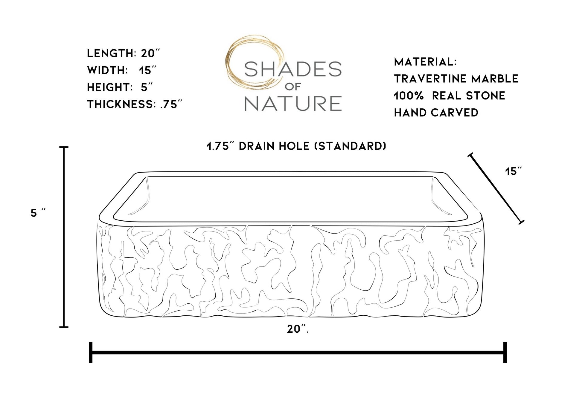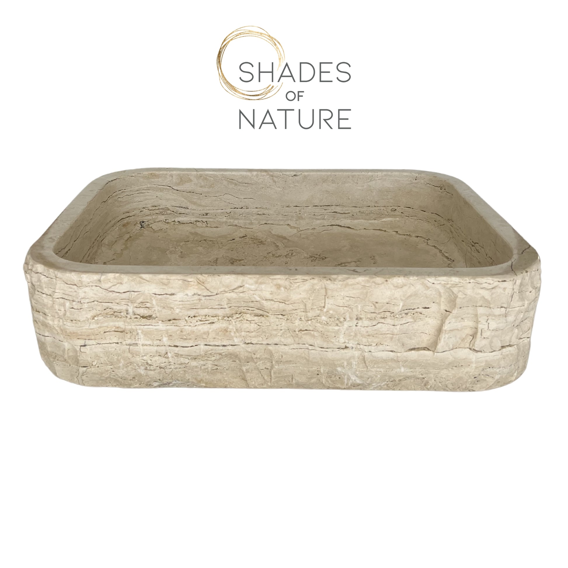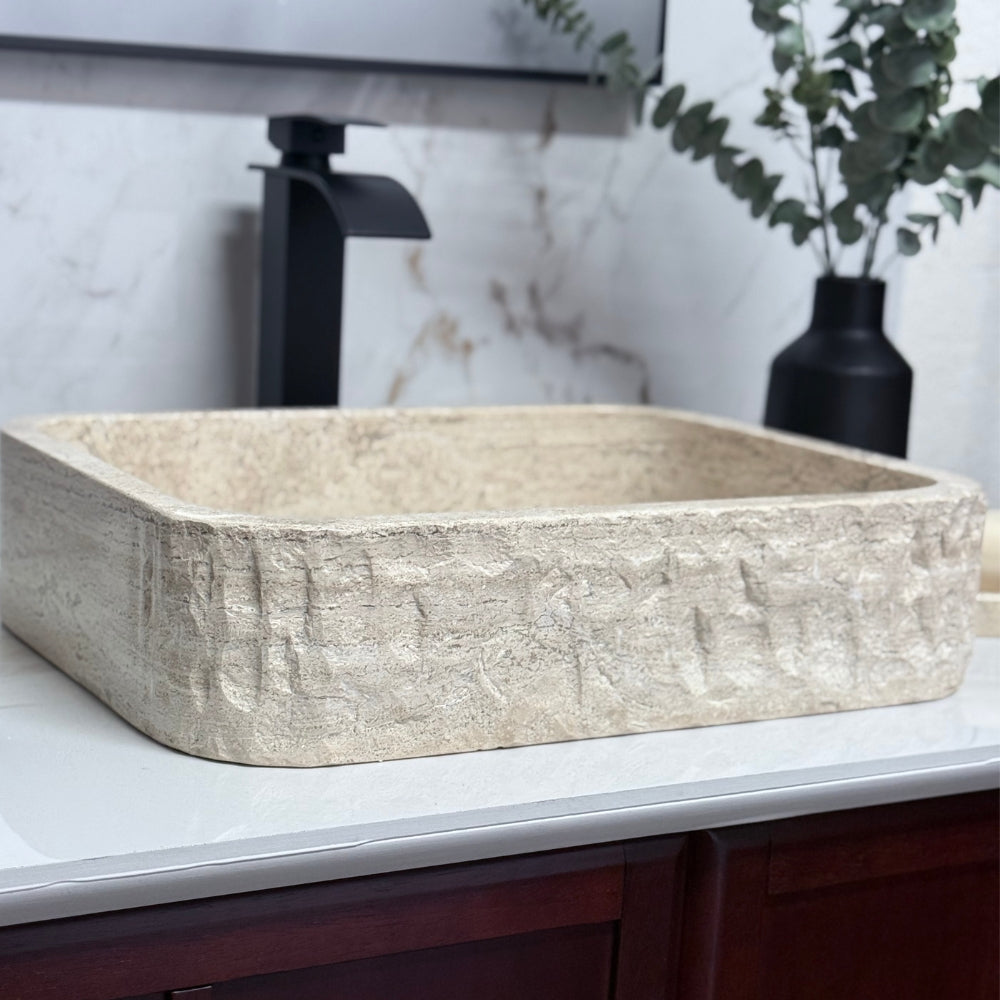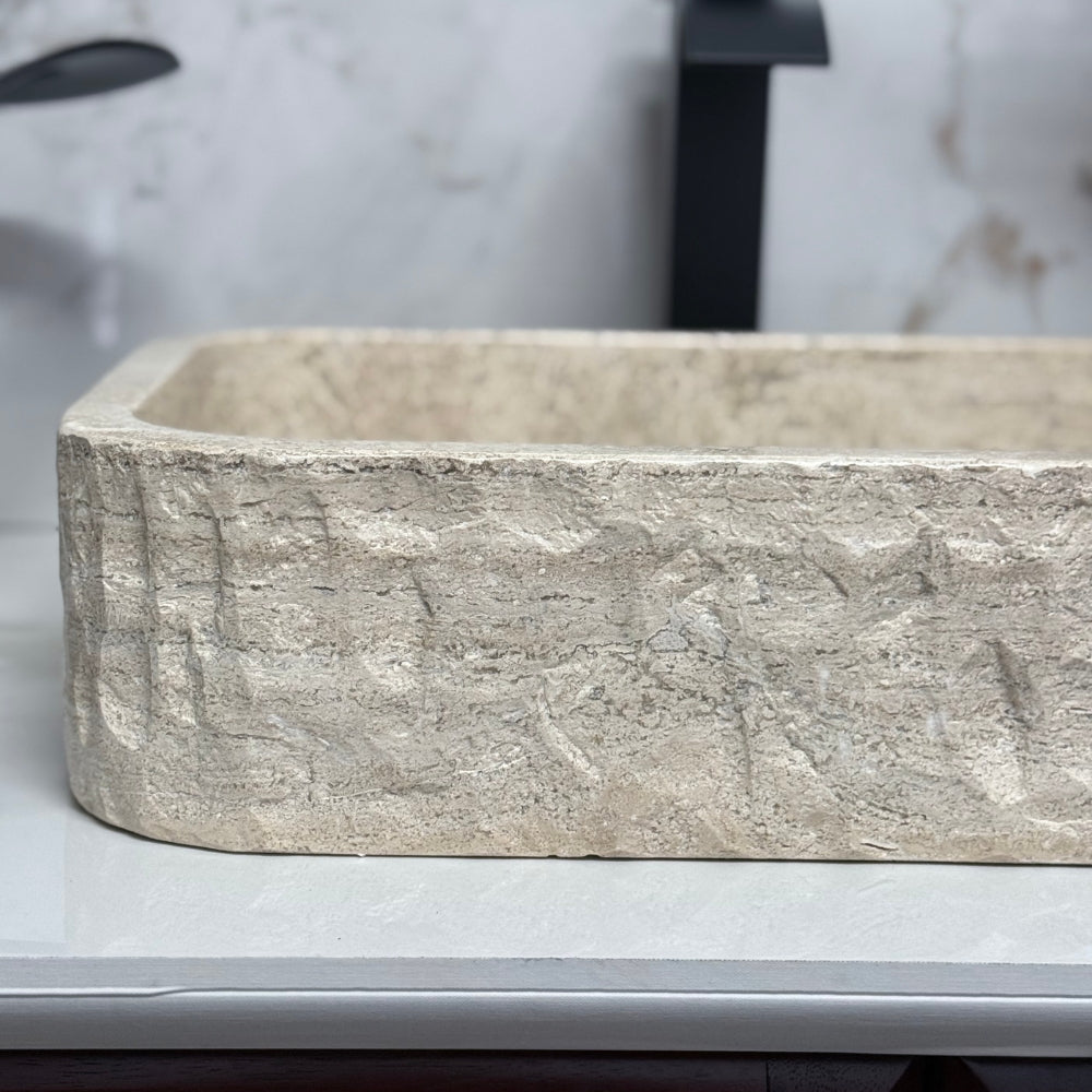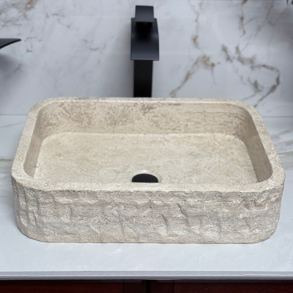 Rectangle Travertine Vessel Bathroom Sink – Handmade Natural Stone Marble Sink – Chiseled Tan Travertine Hand-Carved Stone